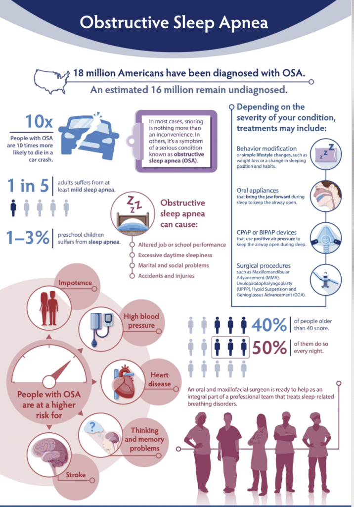 The National Sleep Foundation estimates that 18-20 million adults have obstructive sleep apnea, and it likely affects 2–3% of children. Many people with OSA may not realize they have a problem. If someone close to you has mentioned loud snoring or noticed that you often wake up abruptly gasping for air, you should consult your oral and maxillofacial surgeon (OMS).